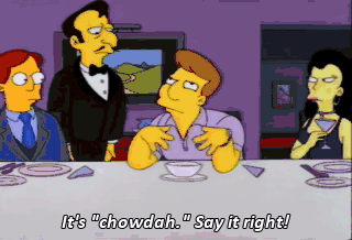 It's "chowdah." Say it right! "Shah-der." Come back here! I'm not through demeaning you!