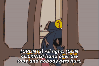 (GRUNTS) All right, (GUN COCKING) hand over the tape and nobody gets hurt. (GUNS COCKING) Oh, this is hopeless. My gun isn't even loaded.