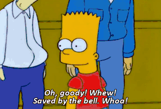 Oh, goody! Whew! Saved by the bell. Whoa! Where do you think you're goin'?