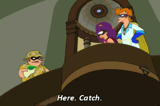 Here. Catch. No, Fry! You can't fall fast enough! I got it! I got it! I don't got it! You saved the Gemerald! Yet the Zookeeper escaped,