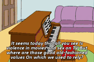 It seems today that all you see Is violence in movies and sex on TV But where are those good old-fashioned values On which we used to rely? Lucky there's a family guy