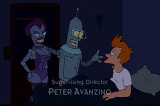 Now can we get some privacy? (MOTOR WHIRRING) (BENDER CHUCKLING) (BEEPING) BENDER: Oh, yeah! Back it on up.