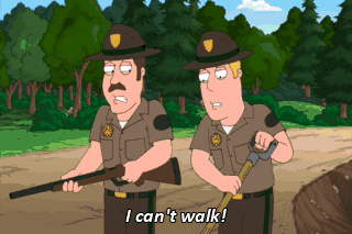 I can't walk! Why the hell can't I walk? This isn't part of the act anymore! No, no, no, don't look. If you make eye contact, you'll have to help. Hey! They're getting away! Release the dogs. (DOGS BARKING)