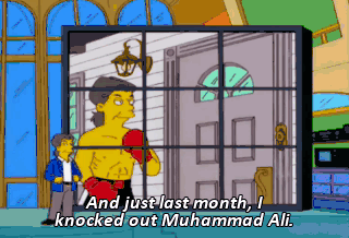 And just last month, I knocked out Muhammad Ali. Oh, how awful. But this is the biggest thrill ever-- the opening of my 112th store!