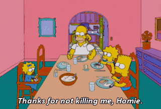 Thanks for not killing me, Homie. Here's an extra pork chop. (LAUGHING) I'm gonna not kill you every week. (ALL LAUGHING) (SINISTER TUNE PLAYING)