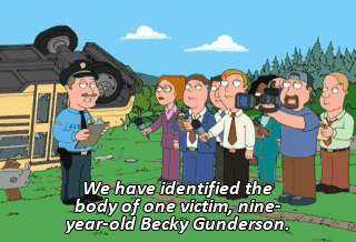 We have identified the body of one victim, nine-year-old Becky Gunderson. (ALL EXCLAIMING) No, wait, that's, uh, Becky Gutierrez. That's not news.
