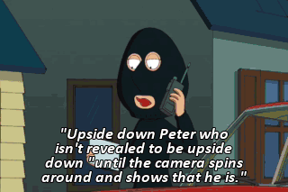 "Upside down Peter who isn't revealed to be upside down "until the camera spins around and shows that he is."