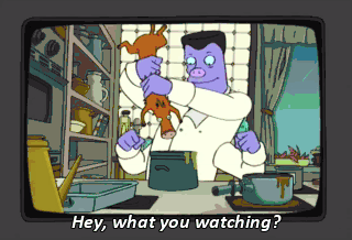 Hey, what you watching? Uh, nothing. Is that a cooking show? No, of course not. It was, uh... porno. Yeah, that's it. Bender, I didn't know you liked cooking.