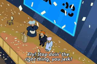 Fry! Stop doin' the right thing, you jerk! Let Mom buy the company! We all want to be filthy, stinking rich! Trust me. Two out of three doesn't cut it. You mean, you'd rather be rich than work together? Hell yeah!