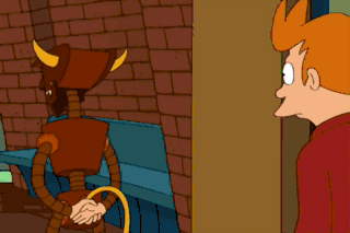 Hello, Fry. just dropped by to make sure you're as happy with our little deal as I am. Oh, g-give me back my hands!