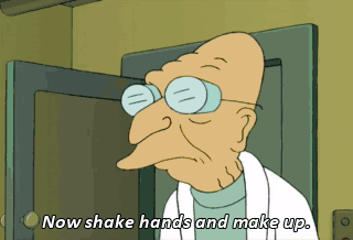 Now shake hands and make up. You want a banana? I don't eat bananas. I prefer banana-flavored energy bars made from tofu. I don't like you.