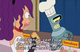I don't know. Last I saw, he was jumping up and down in my meat grinder. By the way, you got a little something right there. This is the best sausage I've ever tasted! Oh, my God! That looks like Fry's hair!
