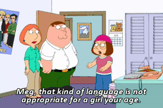 Meg, that kind of language is not appropriate for a girl your age. Or is it? I'm gonna be 17, you jerks. She's the jerk.