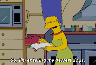 So, I'm entering my dessert dogs. It's deep-fried cookie dough with meringue buns, cherry ketchup, and caramel mustard. Mmm! It's dessert but it's hot dogs, so it's good for you.