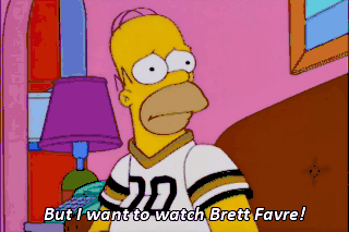 But I want to watch Brett Favre! Come on, Homer. They're only in town for eight months. Then they're gone. Oh! I missed one of Jerry's zingers. Now I'll never catch up.