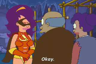 Okay. And would it kill you to use some mouthwash? Hey, Fry, we've still got our costumes on. - Wanna steal some more stuff? - I guess. As long as you think it's right. Superheroes away!