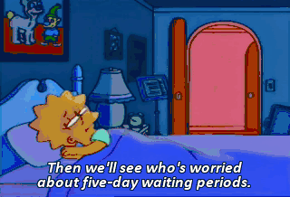 Then we'll see who's worried about five-day waiting periods. Dad, it's 3:00 a.m.! Can't you mutter in your room? Marge kicked me out. All right. Go ahead.