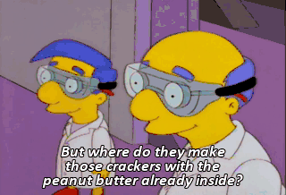 But where do they make those crackers with the peanut butter already inside? Uh, put this on and come with me, son. Whoo-hoo!