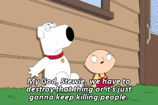 My God, Stewie, we have to destroy that thing or it's just gonna keep killing people. Oh, my God, a baby! Are you okay?