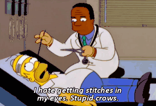 I hate getting stitches in my eyes. Stupid crows. Don't be mad at the crows, Homer. They weren't trying to blind you. They were just trying to drink your sweet, sweet eye juices.