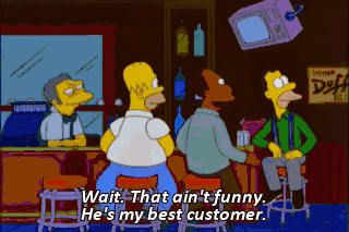 Wait. That ain't funny. He's my best customer. Well, the handwriting's on the wall. To stay afloat, this bar is gonna have to go queer. You mean it's not? Oh. Wrong again, Gay Guide to Springfield.