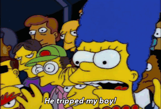 He tripped my boy! I demand vengeance! I want vengeance! jimbo jones called for tripping. The penalty shot will be taken by Bart Simpson.