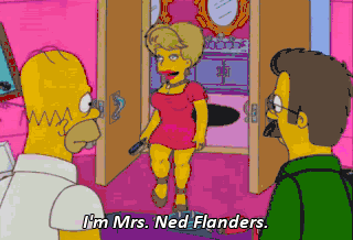 I'm Mrs. Ned Flanders. G'ah! Hey, smooth move, Flanders. And I'm Mrs. Homer Simpson. Here comes that vomit again. Eww.