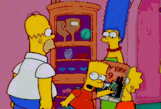 Great! We're all going to New York! Lousy Bart and his money. All right, New York, I'm comin' back! But you're not gettin' this! Dad, our baby pictures were in there. Don't you start!