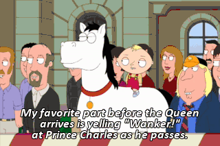 My favorite part before the Queen arrives is yelling "Wanker!" at Prince Charles as he passes. Wanker! Wanker! I know, I know. Wanker! Wanker! Yes, I know. Yes. Wanker! You're a wanker! Wanker!