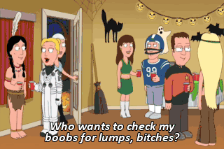 Who wants to check my boobs for lumps, bitches? (ALL LAUGHING) I'll be back late. Don't wait up.