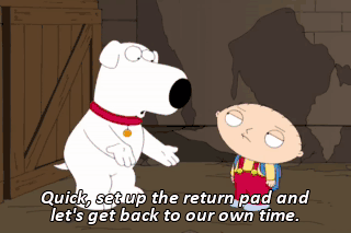 Quick, set up the return pad and let's get back to our own time. Right. What's wrong? Why are we still here? I don't know. Stewie, it's not working. Yeah, and you know what's not gonna fix it? Your shouting.