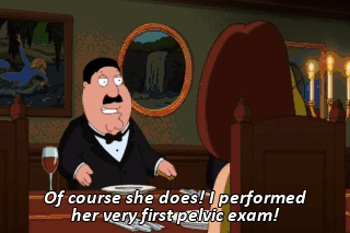 Of course she does! I performed her very first pelvic exam! Unless I'm confusing you with someone else. Nope. That was... That was you. (FOOTSTEPS APPROACHING)