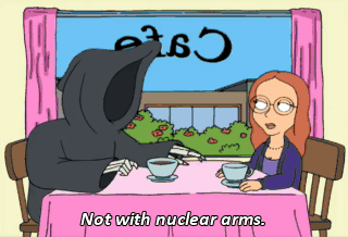 Not with nuclear arms. You can't hug your children with nuclear arms. Check, please.