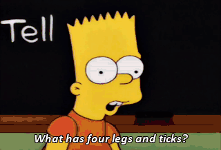 What has four legs and ticks? A walking clock? A walking clock! I'd wager he has some variety of walking clock in that box. Bart, is it a walking clock? What? No, it's my dog.