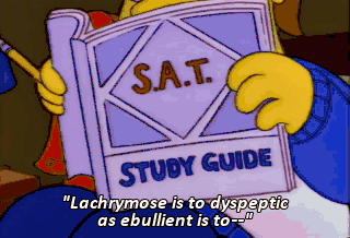 "Lachrymose is to dyspeptic as ebullient is to--"