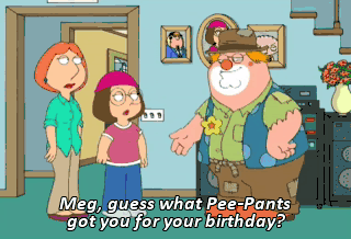 Meg, guess what Pee-Pants got you for your birthday? A scarf. I don't want a scarf, Dad. Well, then, how about a dozen scarves? (SINGING)