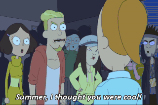 Summer, I thought you were cool! I'm sorry, okay? How can you be such a bitch? Oh, my god, Morty. Your sister crossed Tiny Rick? Talk about self-destructive. Yeah.