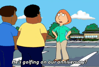 He's golfing on our anniversary? Oh, boy! You just put Peter in the doghouse. Which is where your mother-- Don't say it! Your mother smells. seE? This is why I hate clothes shopping.