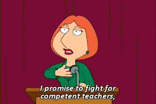 I promise to fight for competent teachers, a better-funded music department and updated textbooks that don't refer to the Civil Rights Movement as "trouble ahead".
