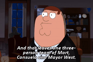 And that leaves one three-person team of Mort, Consuela and Mayor West. All right. Let's do this.