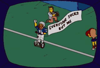 Everyone sucks but me. Oh, yeah. Cheer for Tom. Give all your love to Tom. (LAUGHS) I'm the worst thing to happen to sports since Fox. Master, you are truly a fool.
