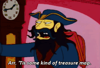 Arr. 'Tis some kind of treasure map. - You idiot, you can't read. - Aye, 'tis true. My debauchery was my way of compensatin'. "Dear Marge, You have given me your hand in marriage.