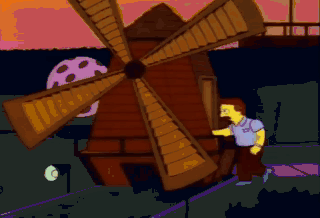 Homer, you turn the blades too fast. The golfers are complaining. Slow down! That's better. Ah, beautiful. Keep this up and someday you'll be the guy who hands out the putters. Yes, sir!