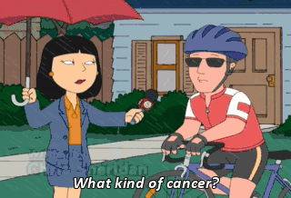 What kind of cancer? It's rectal cancer. It's slowly eating away at my lower insides. It's a quick process, both painful and untreatable, and it's a great way to stay in shape.