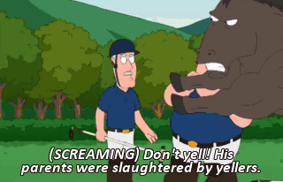 (SCREAMING) Don't yell! His parents were slaughtered by yellers.