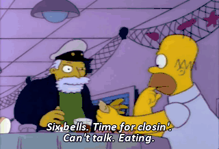 Six bells. Time for closin'. Can't talk. Eating. Fairly warned be thee, says I.