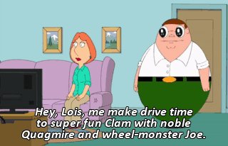 Hey, Lois, me make drive time to super fun Clam with noble Quagmire and wheel-monster Joe.