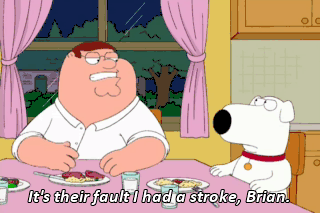 It's their fault I had a stroke, Brian. And I'm gonna sue them for it. Peter, you ate 30 hamburgers. It was your own fault.