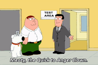 Meaty, the Quick to Anger Clown. Hey, kids! Who likes McBurgertown burgers? I do! There was more to my question! (CRYING)