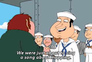 We were just about to sing a song about mopping. We're mopping the deck which is Navy for "floor" And when we're done mopping we'll mop it some more "Swab" means "mop" "deck" means "flooR"